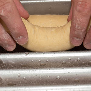 Generously spray a New England–style hot dog bun pan with nonstick cooking spray. Lightly dust the dough rounds with flour. Using a metal bench knife, scrape up a dough round and flip it onto the work surface in front of you. Degas the dough with your hand and press it into a rough 4 by 2-inch oval parallel with the counter’s edge. Fold the far edge of the dough to the center and press to seal. Rotate the dough 180 degrees, then fold and press the other edge (fig. 4.1). Now fold the dough in half and press the seam to seal. Gently roll the dough against the work surface to even out its thickness and stretch it to the width of the pan (fig 4.2). Place the dough seam side down in the one of the slots in the prepared pan (fig. 4.3). Repeat with the remaining dough rounds. Spray a piece of plastic wrap with nonstick cooking spray and lay it over the pan, then set the pan on a rimmed baking sheet. Let the dough rise until it is about ¼ inch shy of the rim (fig. 4.4), 45 minutes to 1 hour. Meanwhile, adjust an oven rack to the lower-middle position and heat the oven to 400 degrees.
