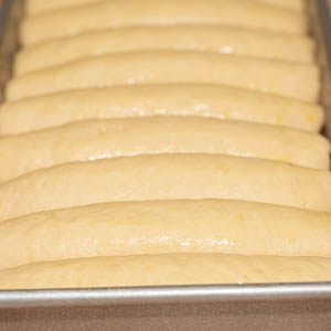 In order to achieve the quintessential flat-bottomed New England hot dog bun aesthetic, we chose a pan with prefab slots for each bun. Shaped and portioned individually, the buns proof and bake as a single piece, then are cut or scissored apart post-bake. We like this one made by USA Pans.