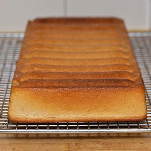 To get perfectly square tops, however, a bit of Yankee ingenuity came in handy: we put an improvised lid over the entire pan toward the end of proofing. Comprising a greased baking sheet weighed down with a cast-iron skillet, the sheet restricts the dough’s rise so the top bakes levelly, and the heft of the skillet prevents dough from spilling out the sides. The rig is removed after the first few minutes of baking. Make sure the baking sheet you use is perfectly level and un-warped.