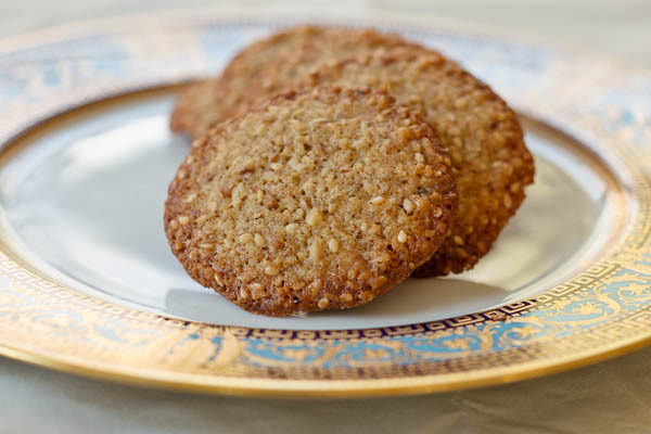 Benne seeds bring distinctive flavor to the foods that bear them. Nothing new about that. When administered with abandon—beyond the usual sprinkle—benne has quite an impact on texture as well. Take a cookie, for instance. You want glass-shatter crisp? Benne’s your go-to seed. But without mitigating ingredients, benne can lose its lacy mosaic and fuse to a crustacean brittle. Southerners add pecans to their famous benne wafers. We threw pecans into our recipe, too, and interrupted the texture further with Anson Mills craggy-cut oats, along with a lavish amount of butter. The resultant cookie has a most extraordinary flavor and texture. Buttery with traces of toffee, short, and crackling, but without being either crunchy-hard or too soft in the center.