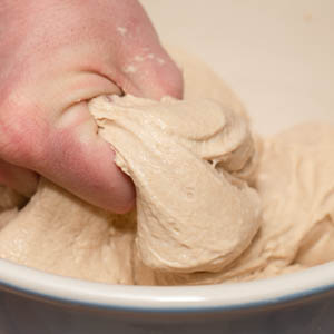 Day 2, 12:00 p.m. —mix the final dough: At this point, the final levain will have nearly tripled in size and boast a pleasant, yeasty aroma; the autolyse will not appear much different than when it was mixed. Add 170 grams of the final levain (reserve the remainder for future levain feedings) and 40 grams of the water to the autolyse and squeeze with your hand, forcing the two to combine into a dough (fig. 4.1). Knead the dough in the bowl for about 1 minute. Cover with plastic wrap and let rest for 15 minutes.