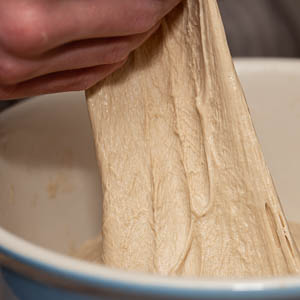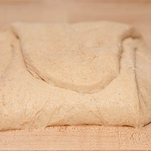 Moisten your hands with water and insert them down the side of the bowl at the 12 o’clock position, then stretch and fold the dough down to the opposite side of the bowl. Rotate the bowl 180 degrees and stretch and fold the dough in the same way. Now rotate the bowl 90 degrees in the same direction and fold, then rotate the bowl 180 degrees in the same direction and fold. You will have given the dough a total of 4 folds. Cover the bowl with plastic wrap and let the dough rise in a warm spot for 30 minutes.
