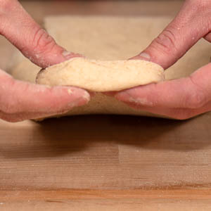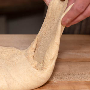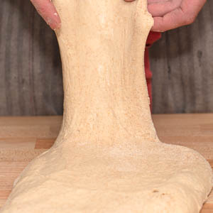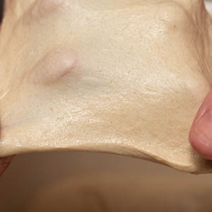 In a small saucepan, warm the remaining 40 grams of water to 90 degrees, then stir in the salt. Add the salted water to the dough and, utilizing the same squeezing method, incorporate the water into the dough; the dough may break apart but will eventually come back together into a uniform mass. Moisten your dominant hand with water and, with the bowl near the edge of the counter, slide your hand, fingers first, down the inside of the bowl at the 12 o’clock position. Grab the dough, stretch it up, and fold it over to the opposite side of the bowl (fig. 5.1). Rotate the bowl 90 degrees and repeat the process; moisten your hand as needed to prevent sticking, working swiftly and with decisive movements. Continue stretching, folding, and rotating the dough for about 1 minute, until it begins to resist stretching. Allow the dough to rest for 2 minutes, then repeat the stretching and folding until it once again begins to resist. Repeat this intermittent mixing method until the dough is smooth and very extensible. To test the dough for sufficient gluten development, pinch off a 2-inch piece and gently stretch it with both hands; it should stretch to translucency (fig. 5.2) but will tear rather easily. If it tears before it reaches translucency, continue to stretch and fold the dough for a few minutes more, then retest.