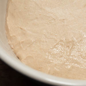 Day 2, 12:15 p.m. —begin bulk fermentation: If there are a few inches of headroom in the bowl for the dough to rise, leave the dough in the bowl (fig 6.1); if the sides of the bowl are mucky, scrape them clean with a plastic bowl scraper. If the bowl lacks adequate headroom, transfer the dough to a larger thick-walled bowl. Cover tightly with plastic wrap and place in a warm area, one where the dough will maintain an internal temperature of 78 to 80 degrees. Let the dough rise for 30 minutes.