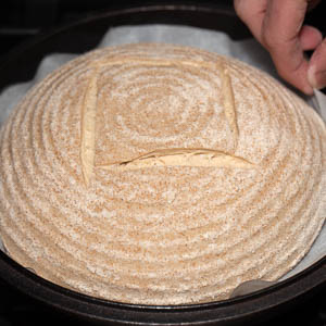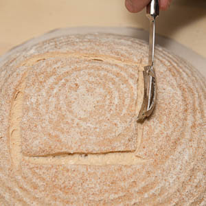 Day 3, 10:00 a.m. — bake the loaves: Remove the brotforms from the refrigerator. Cut out two 10-inch rounds of parchment paper and place one on a pizza peel. Uncover one of boules and lightly dust it with flour. Using heavy-duty oven mitts, very carefully remove one of the combo cookers from the oven; close the oven door. Separate the combo cooker into its two components; the boule will be loaded into the shallower pan and the deeper pan will serve as a cover to create a sealed environment. Using your fingertips, very gently pull the edge of the dough away from the brotform to release it from the sides, then carefully tip the dough out of the basket onto the parchment round on the peel. With a baker’s lame or small, razor-sharp knife held at a 45-degree angle to the boule, slash a 4-inch square at the center (fig. 13.1); don’t cut too deeply, as this could collapse the dough’s structure. Swiftly slide the boule with its parchment into the shallow pan of the combo cooker; center the boule in the pan if needed (fig. 13.2). Cover with other part of the combo cooker and place in the oven. Repeat the process with the remaining loaf and combo cooker.