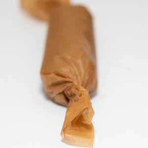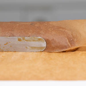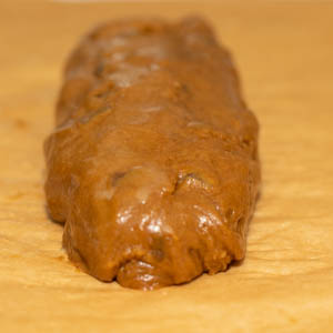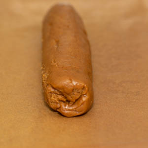 Cut two 9 by 6-inch pieces of parchment paper. With a plastic dough scraper, divide the dough in half (about 7.2 ounces each) and drop each half horizontally onto one of the parchment sheets, forming it into a rough log along the center of the sheet. Moisten your hands with water and shape each piece of dough into a 7-inch cylinder about 1 inch in diameter (fig. 4.1). Tightly roll up each cylinder in the parchment, using a small metal spatula to tidy the dough and push it back toward the beginning of the roll (fig. 4.2), then twist the ends of the paper like a candy wrapper (fig. 4.3). Refrigerate for at least 2 hours or up to overnight.