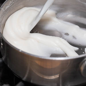 In a heavy-bottomed small saucepan, whisk together the rice flour and water. Set the pan over low heat and cook, stirring constantly with a small silicone spatula and scraping the bottom of the pan, until the mixture has gelled into a thick paste (fig. 1.1) and registers 160 degrees on an instant-read thermometer. Press a piece of plastic wrap directly against the surface to prevent a skin from forming, then refrigerate until the yudane is cool to the touch, about 30 minutes.