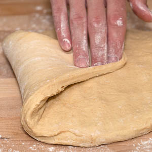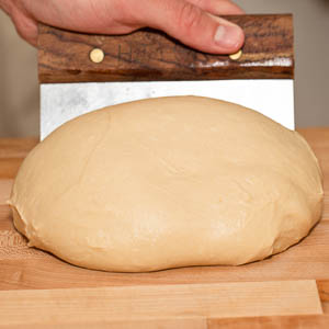 We make the yudane in our recipe by cooking Carolina Gold rice flour and water into a thick paste. The paste is combined with the liquid ingredients and yeast before dry ingredients are added, producing a dough that is as smooth and stretchy as taffy. When handling strong, wet doughs like this, water, not flour, is, the preferred medium for bench work. Use a splash as a contact barrier between the dough, the work surface, and baker’s tools, including your hands. If the final dough grabs, sprinkle a few droplets and take control of the situation.