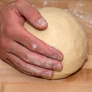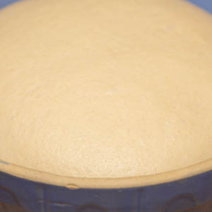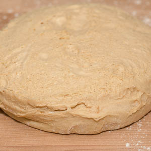 Lightly flour the work surface and dust the surface of the dough with flour. Run the bowl scraper around the edges of the dough to release it from the bowl, then invert the bowl, allowing the dough to drop onto the floured surface. The dough will be very puffy (fig. 5.1), a sign of healthy fermentation. Sprinkle the dough with flour and pat it with your hands to de-gas thoroughly.