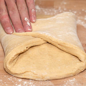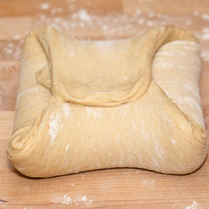 Take the right edge of the dough and fold it to the center (fig. 6.1), then fold the left edge to the center (fig. 6.2). Repeat with the bottom and the top. The dough should now be squarish in shape (fig. 6.3). Flip over the dough, cup your hands around its sides, then move your hands together in a tight circular motion, dragging the dough along and allowing its bottom to grip the work surface. Continue to “round” the dough until it forms a compact ball with a smooth, taut surface (fig. 6.4). Cover with a clean kitchen towel and let rest for 15 to 20 minutes.