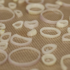 To oven-dry shallots and garlic, we alternated between low oven heat (180 degrees) and convection fan, and no-oven heat and convection fan at intervals of 15 minutes. If your oven has no convection fan, don’t worry. The idea is to dry the aromatics crisp without browning. Shallots and garlic do not dry at the same rate, however, so separate baking sheets and times are indicated. Shallots’ high sugar content also makes them vulnerable to stickiness, so a silicone baking mat comes in handy.