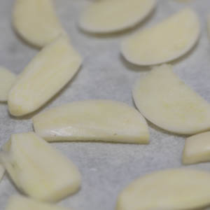 Make the garlic powder: Cut the garlic cloves lengthwise into slices, no thicker than ⅛-inch, preferably slightly thinner. If green germ appears in any of the slices, use the point of a paring knife to remove them. Separate the slices and lay them on the same silicone mat just used for the shallots (fig. 2.1). Use the same drying procedure as for the shallots, noting that the garlic slices will dry and crisp more quickly. They will probably require only one on/off sequence. When all the slices are a pale golden color, remove the baking sheet from the oven and let cool completely (fig. 2.2). Using an electric spice grinder, pulverize the garlic to a powder (fig. 2.3), then transfer to a small airtight container, add a silica pack if you have one, and seal well.